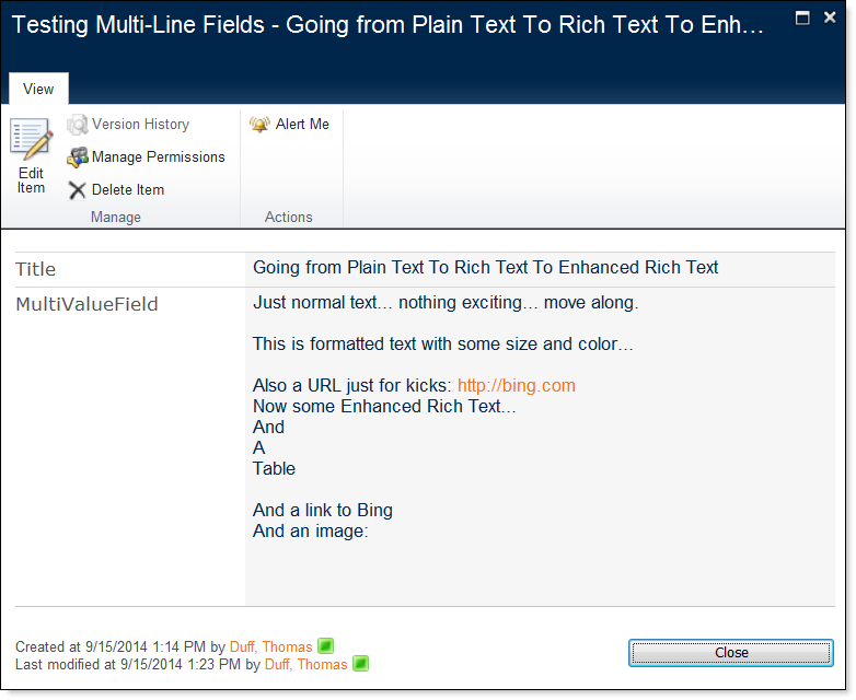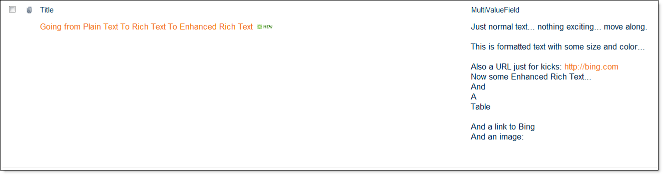 Looking at the form, I’ve now lost all the text formatting and the hyperlink. The Bing URL still shows up, but that’s only because the browser is recognizing it and rendering it as a URL. If I put the form in edit mode, it would just be text. Also, the “And A Table” text has gone from being on one line to being on separate lines:
